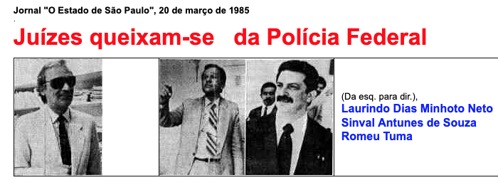 “Juízes da Justiça Federal em São Paulo suspeitam do envolvimento da Polícia Federal na fraude do Inamps, alguns dos quais isentando o superintendente Romeu Tuma. Ontem, três deles — Sinval Antunes de Souza, da 11ª Vara, Laurindo Minhoto Neto, da 3ª, e João Carlos da Rocha Matos, da 12ª — disseram que causa no mínimo “estranheza” a demora da polícia para executar sete ordens de prisão preventiva, cinco pedidas pela procuradora Silvana Fazzi, do Ministério Público, e duas decretadas pelo juiz da 11ª Vara: “Chega de palhaçada. Chega de dizer que eles fazem tudo se não fazem nada”, afirmou Minhoto. “A atuação da polícia causa espécie, causa estranheza e causa também mal-estar”, disse Antunes. “Vou mandar abrir um inquérito para saber onde sumiu uma das fitas que mandei degravar, se foi aqui na minha gaveta, se foi a caminho da polícia ou se foi na casa da polícia”, ressaltou João Carlos.”