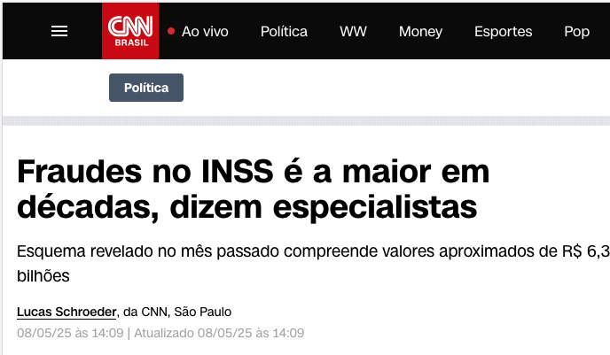 ANO 2025: Mais um estrondoso escândalo de corrupção. Em Abril de 2025 estourou o escândalo de corrupção do INSS. As fontes de corrupção estão dentro dos três poderes e nisso o Brasil se supera desde 1889.